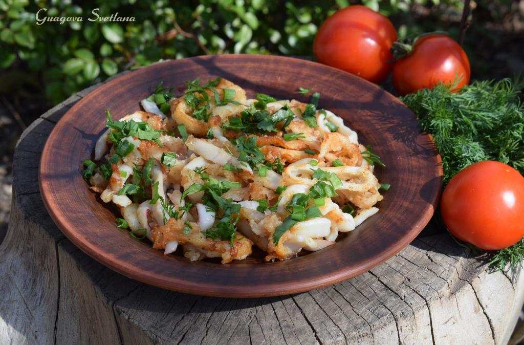 Выкладываем кальмаров на блюдо для подачи и посыпаем мелко рубленной зеленью и чесноком. Кушать желательно в горячем или тёплом виде, пока кляр хрустящий. Жареные кольца кальмаров получаются очень вкусными, нежными, сочными внутри, с хрустящим кляром снаружи.