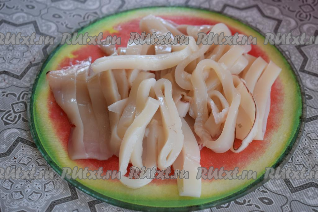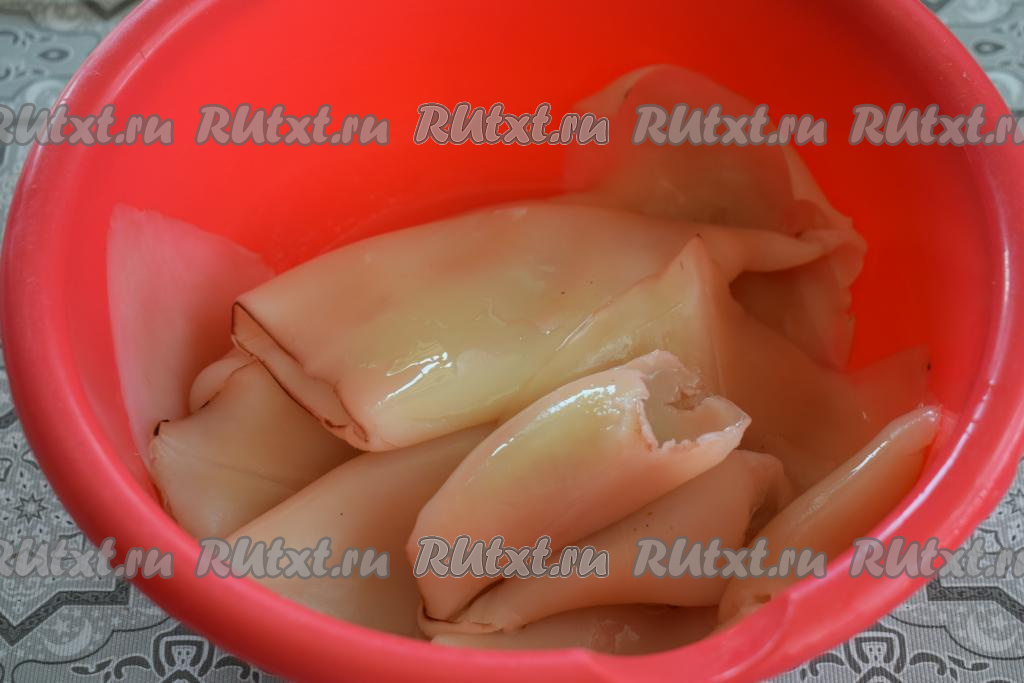 Размораживаем кальмаров при комнатной температуре, удаляем из каждой тушки внутренности и хорду. Тушки кальмаров, не очищая от верхней плёночки, заливаем кипятком и оставляем постоять 1 минуту. Далее промываем холодной водой и снимаем с поверхности тушек свернувшуюся плёночку. Также можно отварить кальмаров, поместив их на 1 минуту в кипящую воду, а затем снять плёнку (снимается она легко).