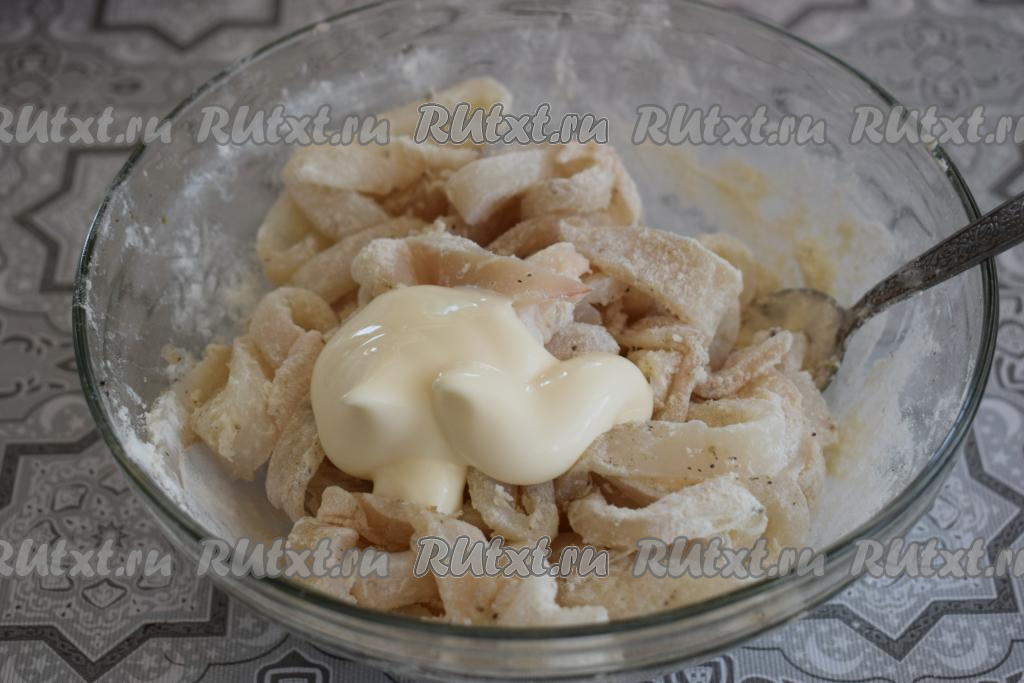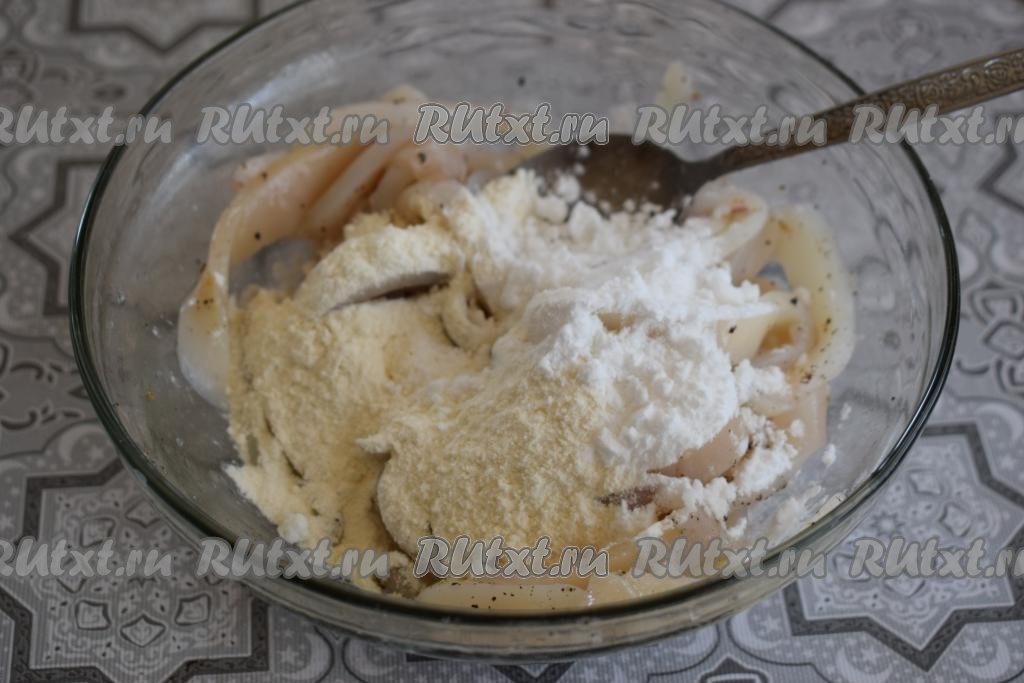 Добавляем к кальмарам муку, крахмал и перемешиваем.