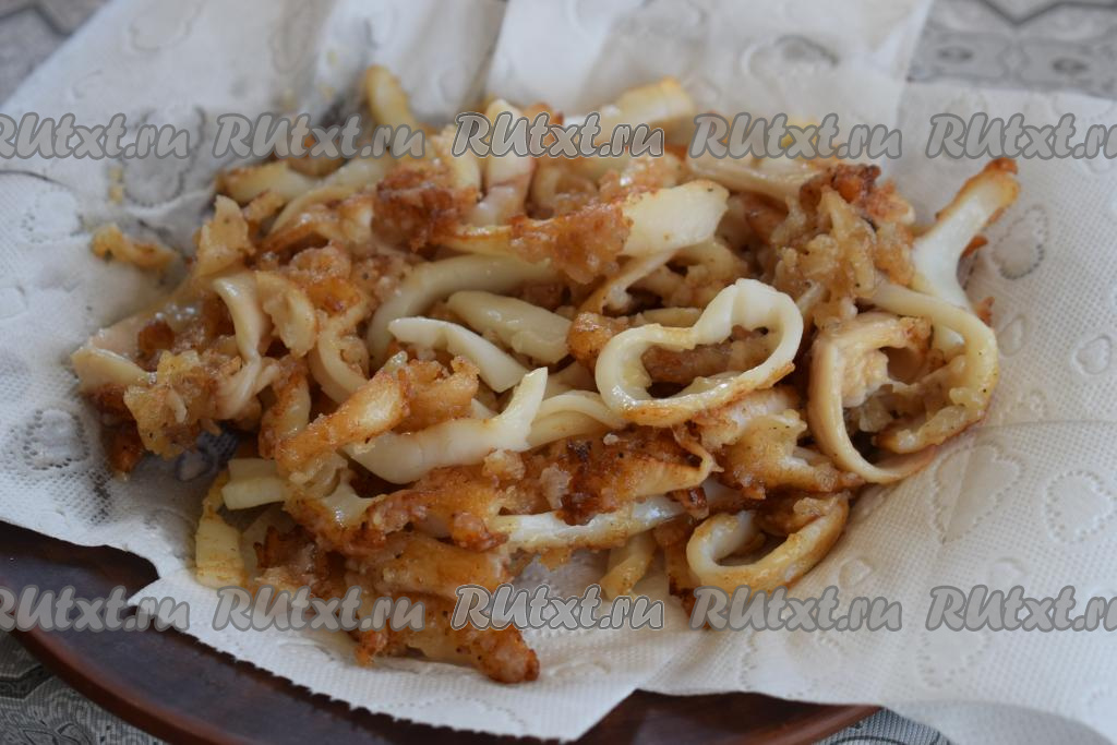 Снимаем кальмаров со сковороды и выкладываем на бумажные полотенца для того, чтобы ушло лишнее масло. Таким образом жарим всех кальмаров.
