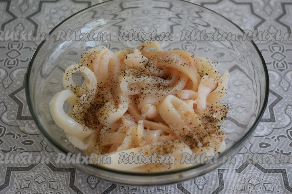 Нарезанных кальмаров обсушиваем при помощи бумажных полотенец, складываем в миску, солим и перчим по вкусу.