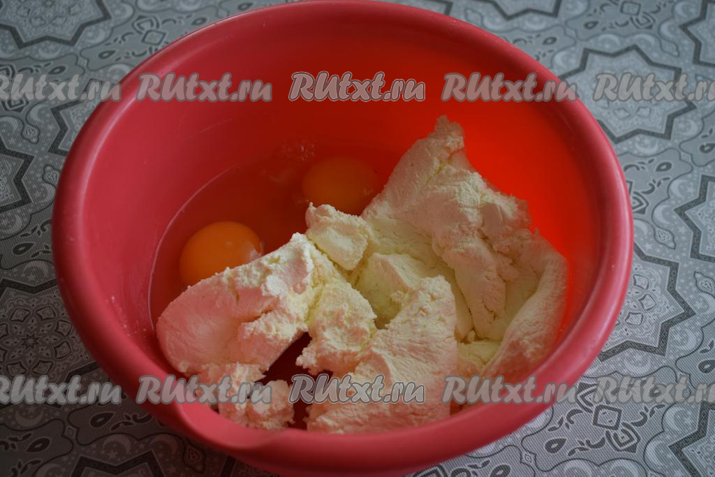 Кладём творог в глубокую миску, сюда же вбиваем яйца.