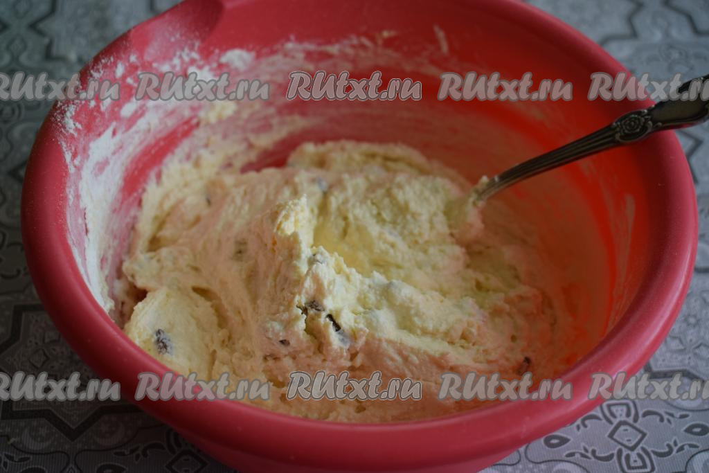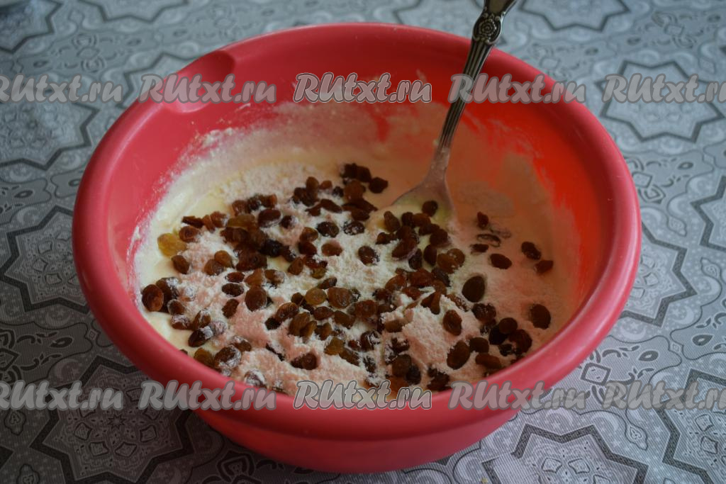 Добавляем к тесту муку и промытый и обсушенный изюм.