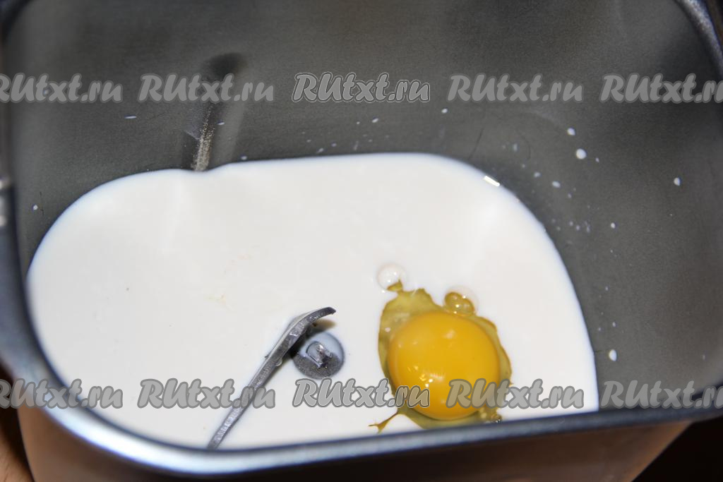 В ведёрко хлебопечки влить молоко комнатной температуры, всыпать соль и сахар, добавить яйцо.