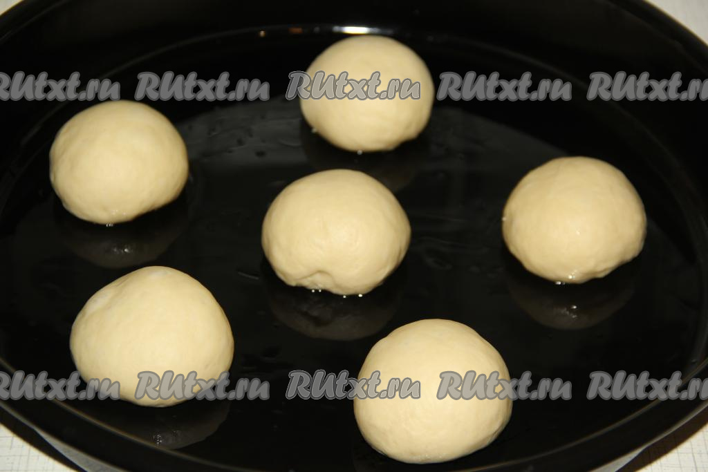Сформировать из теста круглые булочки, выложить их на расстоянии друг от друга на противень, смазанный растительным (или сливочным) маслом, и оставить для расстойки на 30 минут.