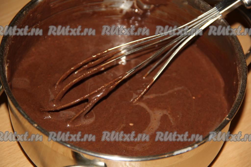 Крем довести на среднем огне до кипения, непрерывно помешивая. После закипания варить крем, не прекращая перемешивать, до загустения (минуты 2). Снять шоколадный заварной крем с огня и полностью остудить.