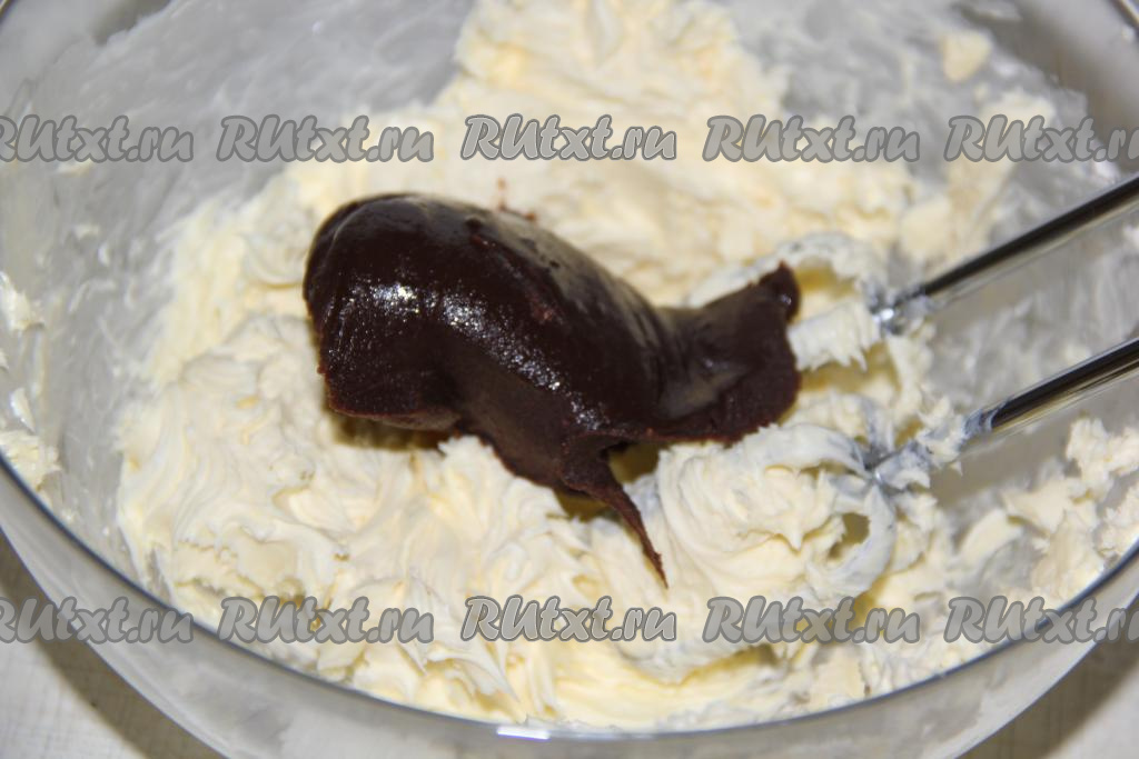 Затем небольшими порциями во взбитое сливочное масло добавлять шоколадный заварной крем, каждый раз взбивая миксером.