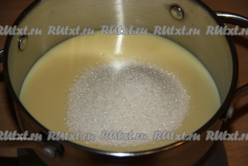 Теперь приготовим шоколадный заварной крем, для этого в кастрюле с толстым дном нужно выложить сгущённое молоко, добавить воду и сахар, перемешать.