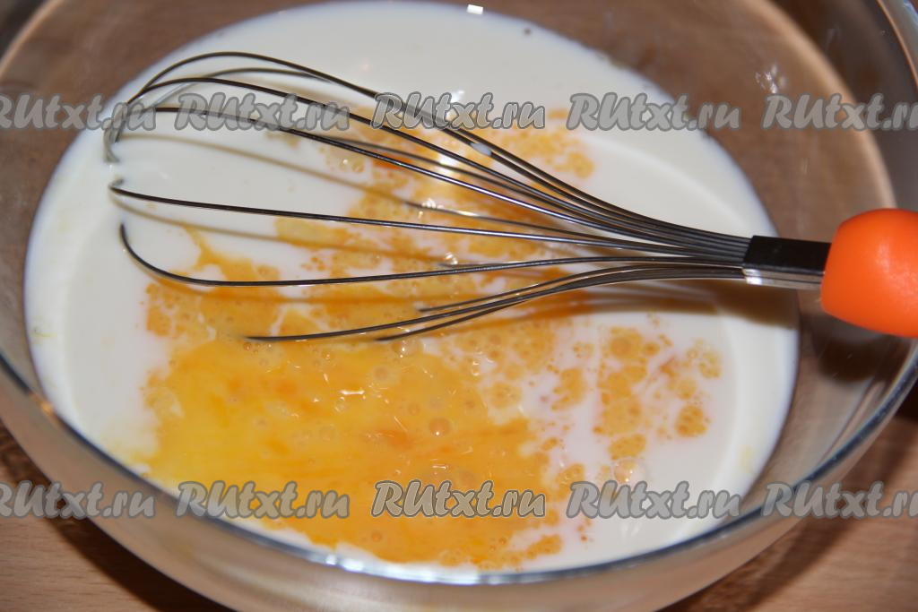 В отдельной миске соединить яйца и молоко, перемешать венчиком.