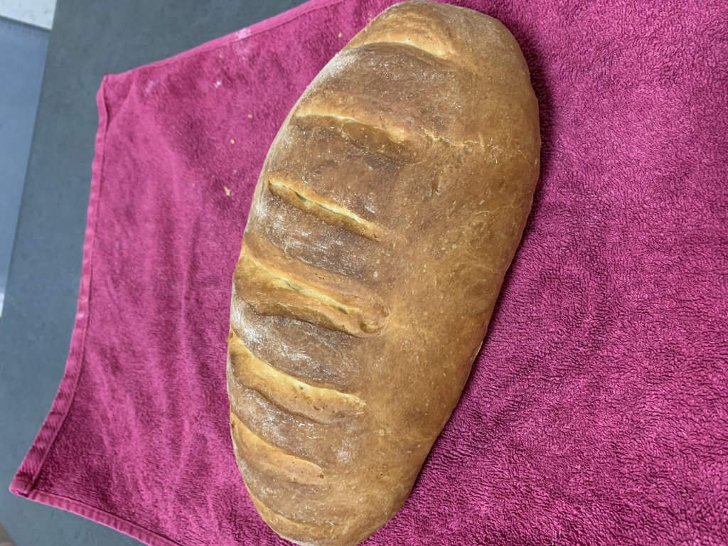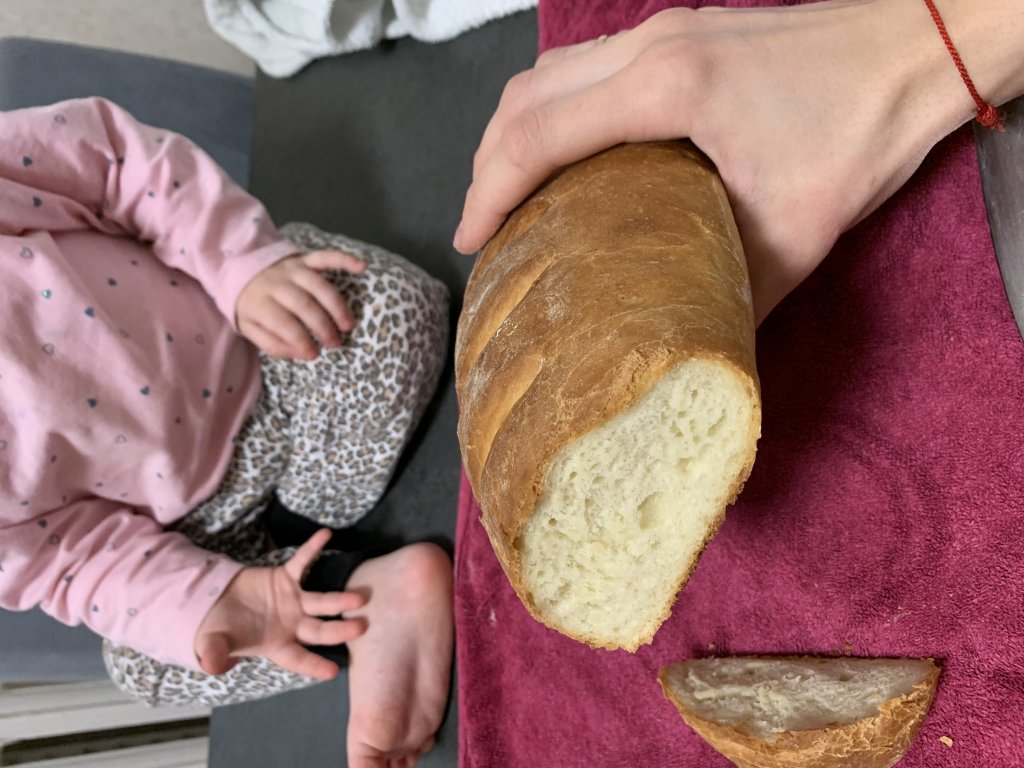 Достаём наш румяный батон из духовки и даём ему отлежаться до остывания, накрыв свежую выпечку полотенцем. Батон, приготовленный в домашних условиях, получается невероятно нежным, мягким, вкусным, при разрезании не крошится, у него однородная и мелкопористая текстура мякиша.
