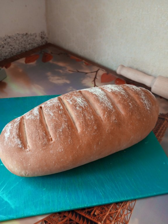 Получившуюся улитку снова растягиваем в пласт и ещё раз сворачиваем рулетом. Формируем из рулетика батон, придавая ему характерную продолговатую форму. Выкладываем батон в форму для запекания (или на противень), слегка смазанный растительным маслом и присыпанный мукой. Посыпаем батон сверху мукой, распределяя её по всей поверхности батона.