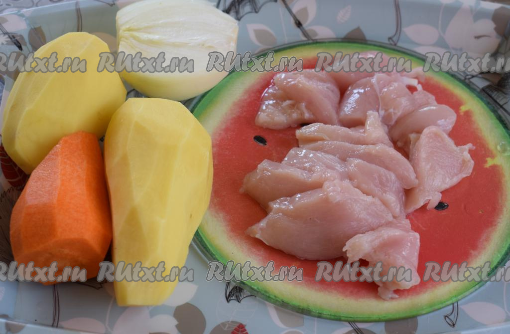 Очистим картофель, морковь и лук, промоем. Куриное филе нарежем на небольшие кусочки.