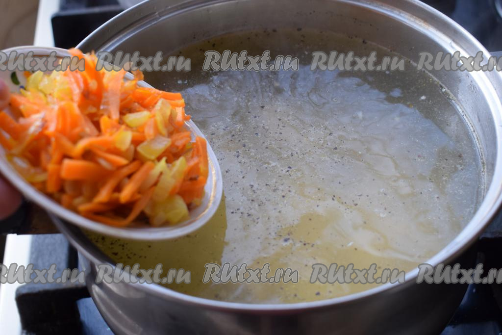 Когда картофель и куриное филе будут готовы, можно добавлять в суп обжаренные овощи.