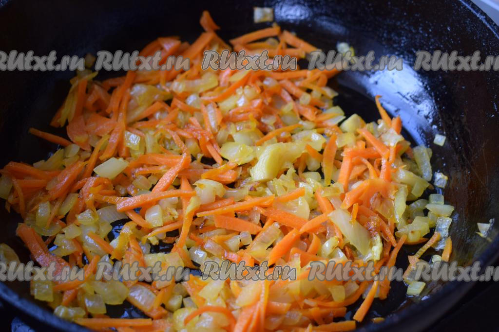 Разогреем сковороду с растительным маслом и отправим в неё наши овощи. На умеренном огне обжариваем морковку с луком до прозрачности, периодически помешивая содержимое сковороды (в течение 5-7 минут).