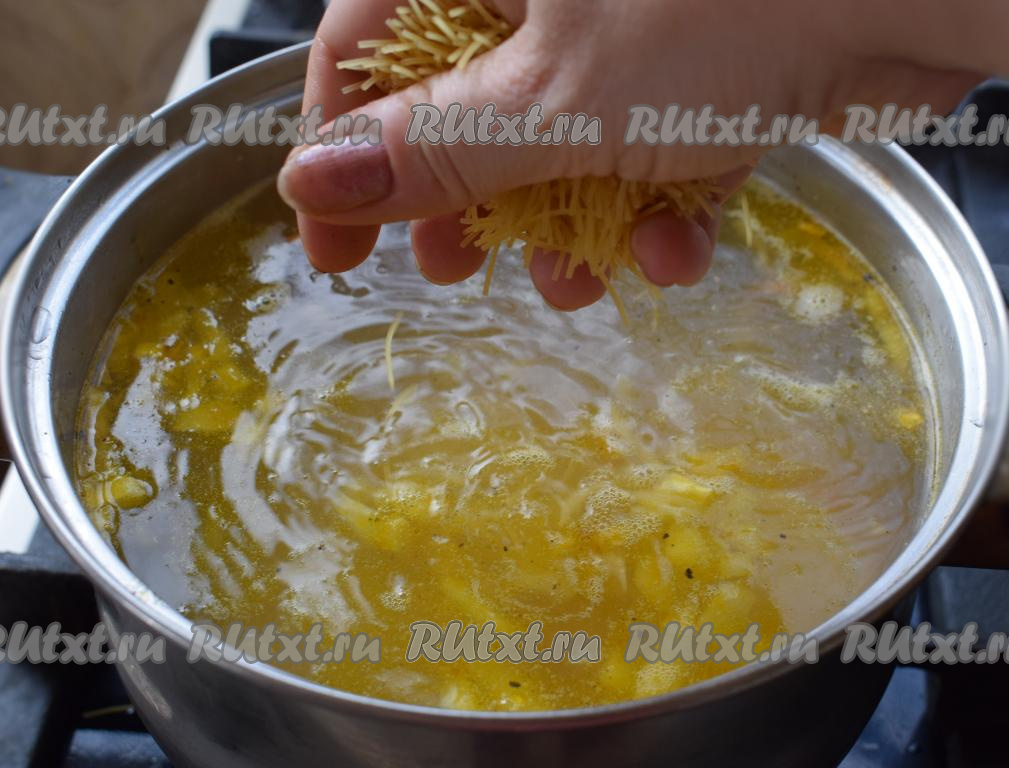В кипящий куриный суп добавляем вермишель и варим с момента закипания, примерно, 2-3 минуты (до готовности вермишели) на среднем огне. Если вермишель у вас не такая тоненькая, то добавить её надо раньше и варить с момента закипания столько, сколько указано на упаковке.
