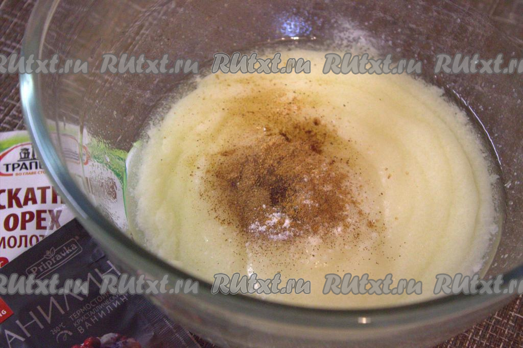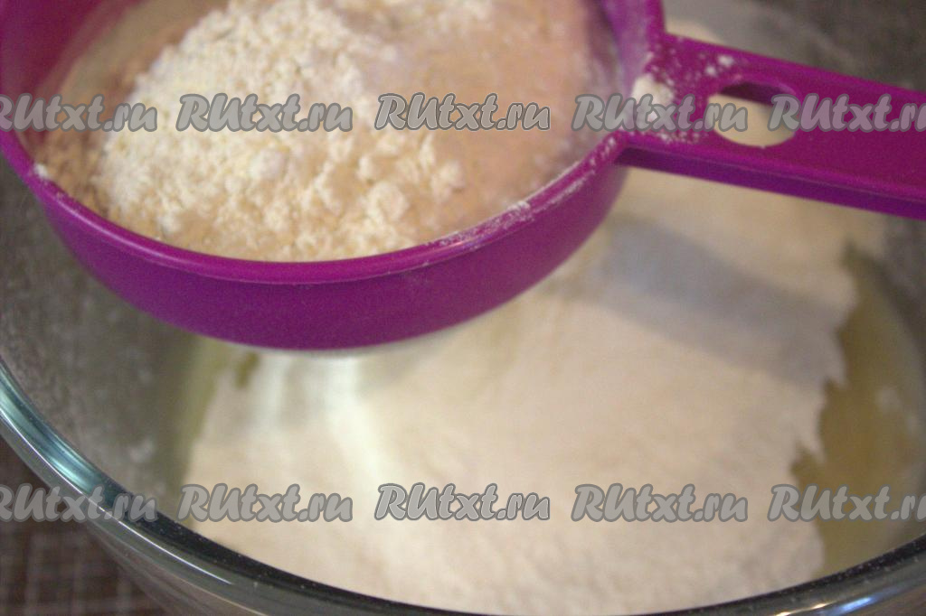 Разрыхлитель перемешать с просеянной мукой. Часть муки добавить в миску, перемешать ложкой.