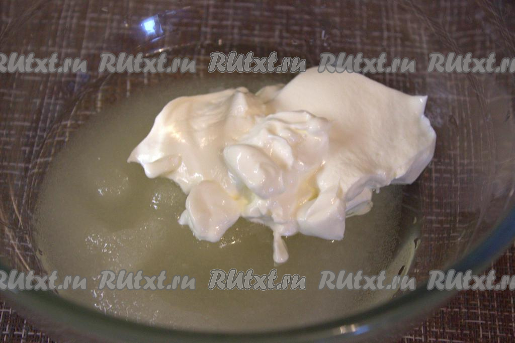 Сюда же добавить сметану любой жирности, снова хорошо перемешать.