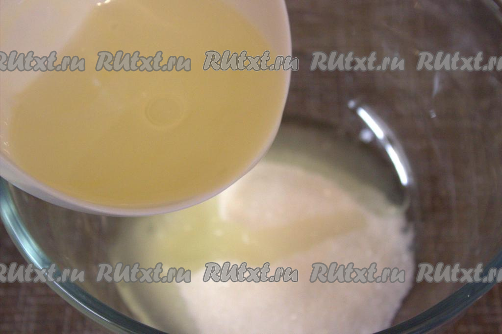 В глубокую миску насыпать сахар, добавить ванильный сахар и растительное масло, перемешать.