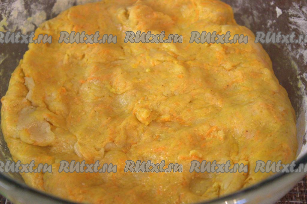 Затем в тесто всыпать оставшуюся смесь муки с разрыхлителем, перемешать (муки может понадобиться чуть больше, это зависит от муки и от сочности морковки). Тесто должно получиться очень нежным и слегка липковатым.
