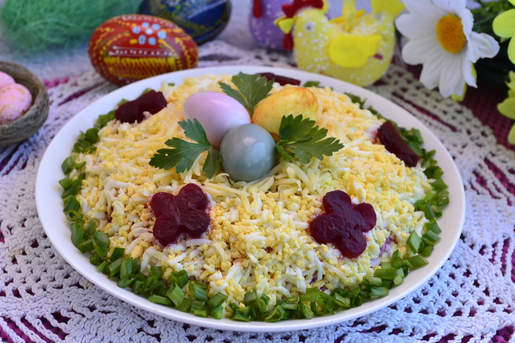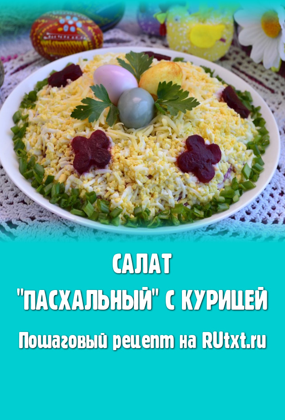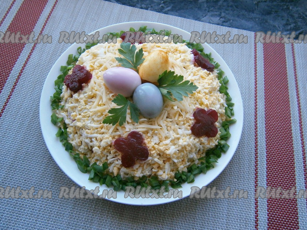 Перед подачей дать простому и очень вкусному салату "Пасхальный", приготовленному с курицей, настояться минут 20 в прохладном месте. Это блюдо станет отличным украшением праздничного стола!