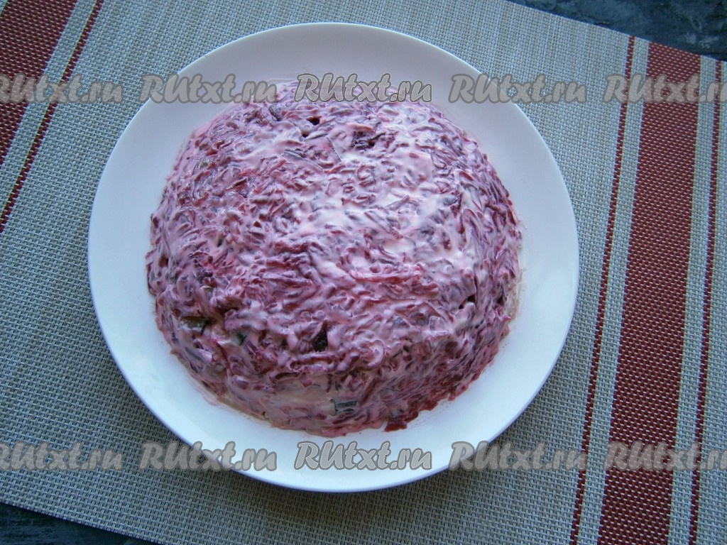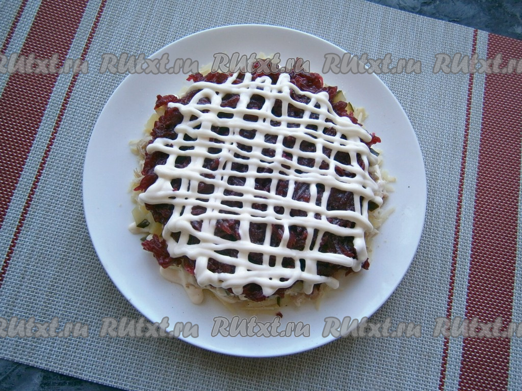 Далее идёт слой натёртой на средней тёрке свеклы (ломтик оставить для украшения), посолить, покрыть сеточкой из майонеза.