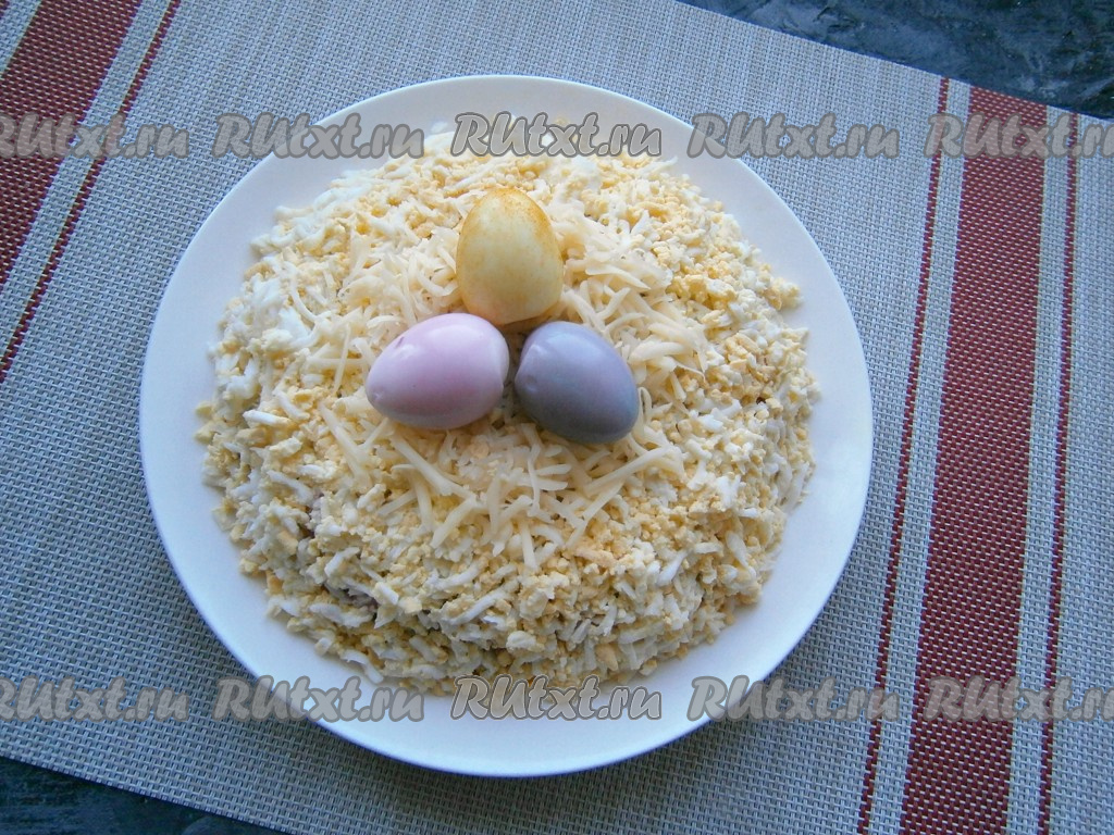 Салат сверху и с боков обсыпать натёртыми куриными яйцами, по середине выложить горку натёртого сыра. Перепелиные яйца очистить и окрасить в разные цвета: соком свеклы, а также куркумой, разведённой в воде, и соком краснокочанной капусты (для окрашивания перепелиные яйца нужно просто покатать в соках или в растворе куркумы - они быстро окрасятся), дать обсохнуть. Разместить окрашенные перепелиные яйца в центре салата.