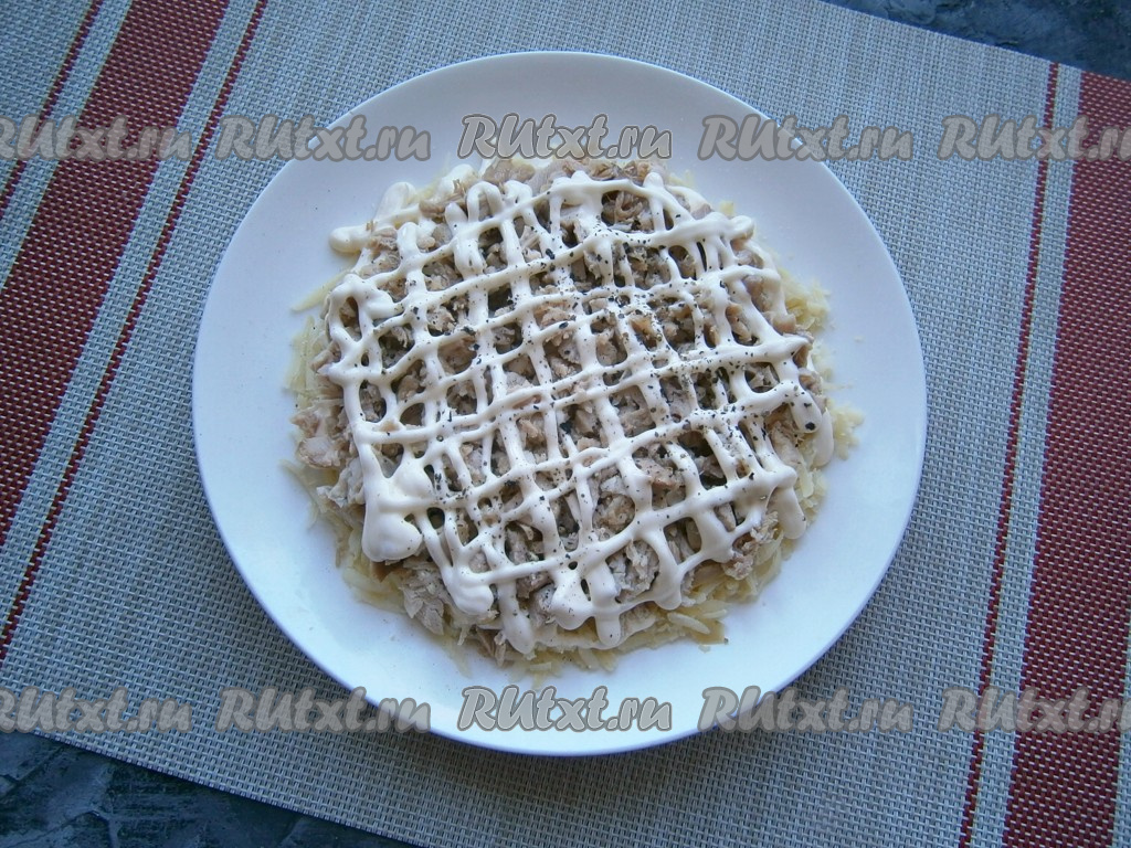 На плоскую тарелку выложить слой натёртого на средней терке картофеля, посолить и нанести сеточку из майонеза.
