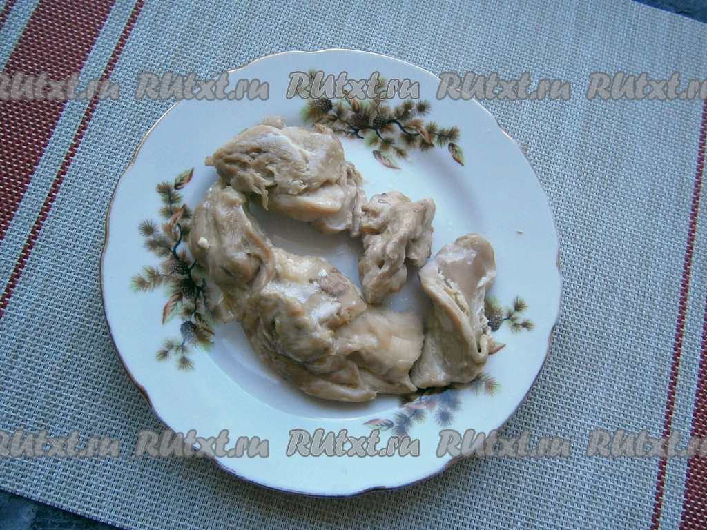 Предварительно отварить свеклу, картофель, яйца и курицу. Свекла варится около 1 часа в кипящей воде, картофель - около 25-30 минут, яйца куриные - 10-15 минут с момента закипания воды, перепелиные - 2-3 минуты с начала кипения воды. Мясо курицы варится в подсоленной воде около 35-40 минут. Яйца и овощи остудить и очистить. Также куриное мясо остудить, если есть кости - убрать.