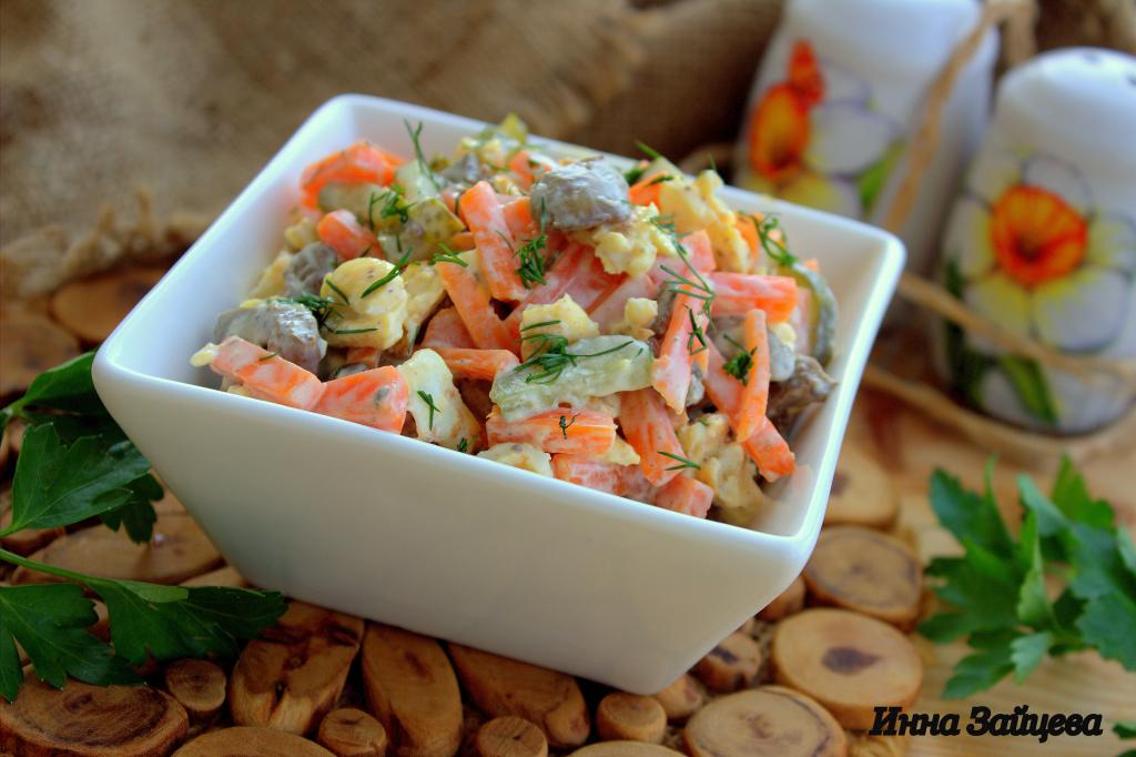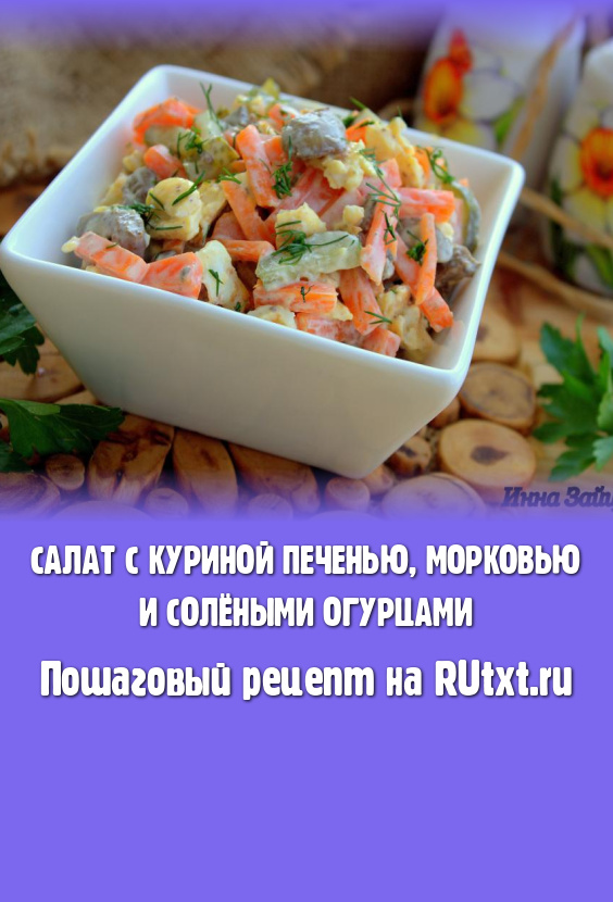 Яркий, вкусный, сытный салат с куриной печенью, морковью, яичными блинчиками и солёными огурцами подать к столу. Это блюдо прекрасно разнообразит меню, попробуйте!