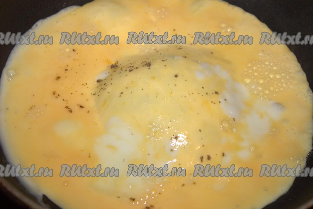 Сковороду смазать растительным маслом, разогреть и влить один половник яичной массы, равномерно распределить, немного посолить и приправить по вкусу специями (я посыпала молотым чёрным перцем). Жарить яичный блинчики с двух сторон на среднем огне до золотистого цвета, затем переложить со сковороды на тарелку. Аналогично приготовить блинчики из оставшегося теста (количество блинчиков зависит от размера сковороды). Яичные блинчики остудить.