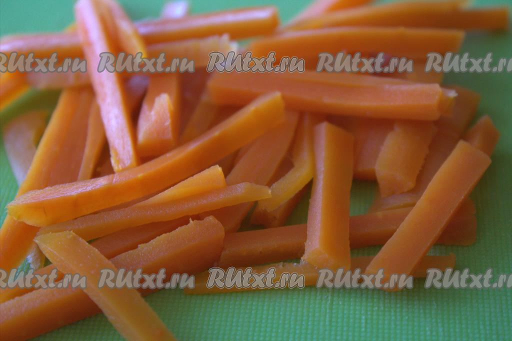 Морковь вымыть и, не очищая, поместить в кастрюлю, полностью залить водой. Кастрюлю с морковкой отправить на огонь и варить с момента закипания на небольшом огне 25-35 минут (время варки зависит от размера моркови). Готовая варёная морковка будет легко прокалываться ножом. Затем, дав моркови остыть, очистить её и нарезать небольшой соломкой.