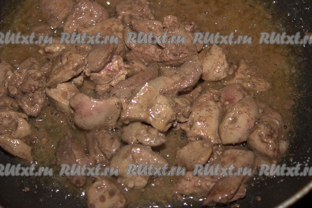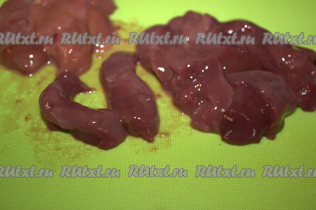 Куриную печень вымыть, очистить от плёнок и прожилок, некрупно нарезать.