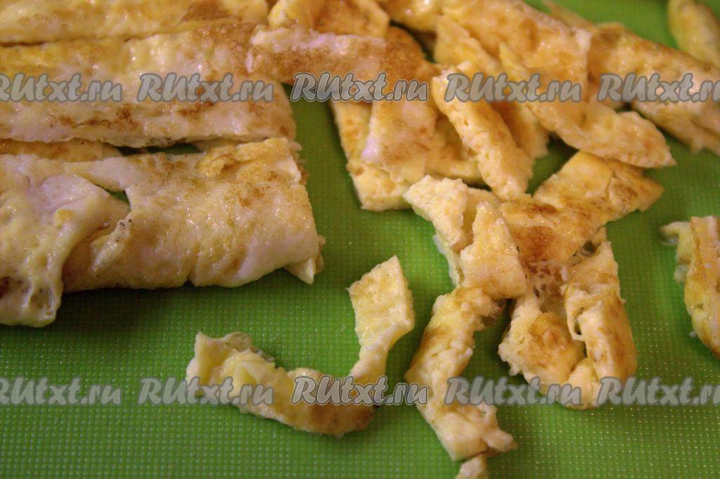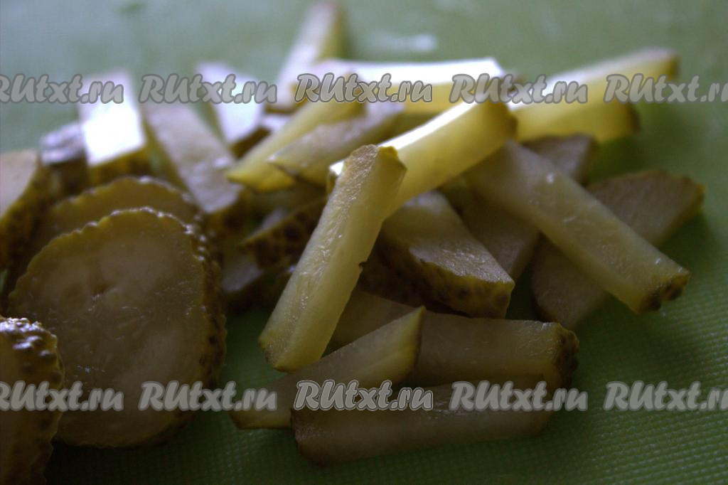 Солёные (или маринованные) огурцы нарезать тонкой соломкой.