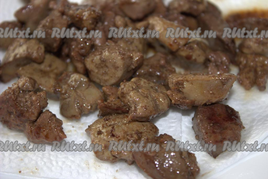 Готовую печень, для того чтобы убрать лишнее масло, выложить на бумажное полотенце и дать остыть.
