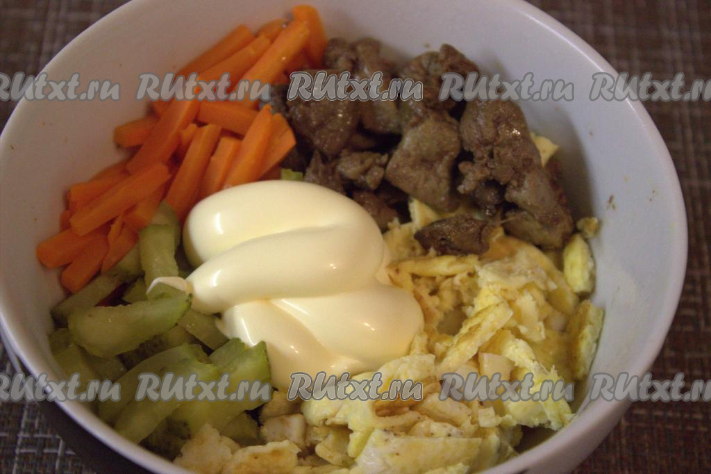В миске соединить нарезанные морковь, огурцы, яичные блинчики и куриную печень, добавить майонез.