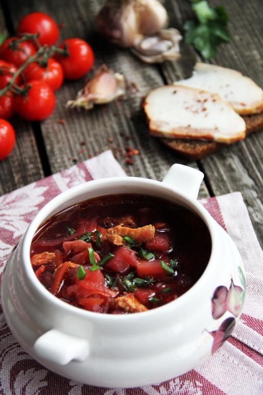 Подать аппетитный, вкусный, достаточно сытный домашний борщ из краснокочанной капусты в горячем виде с рубленной зеленью.
