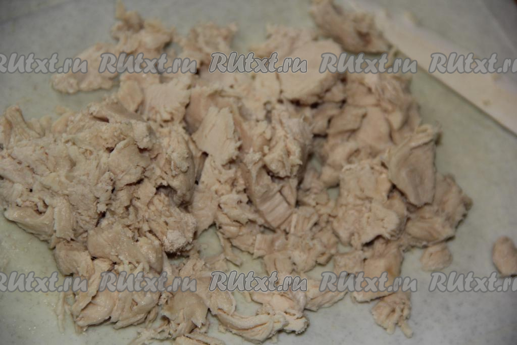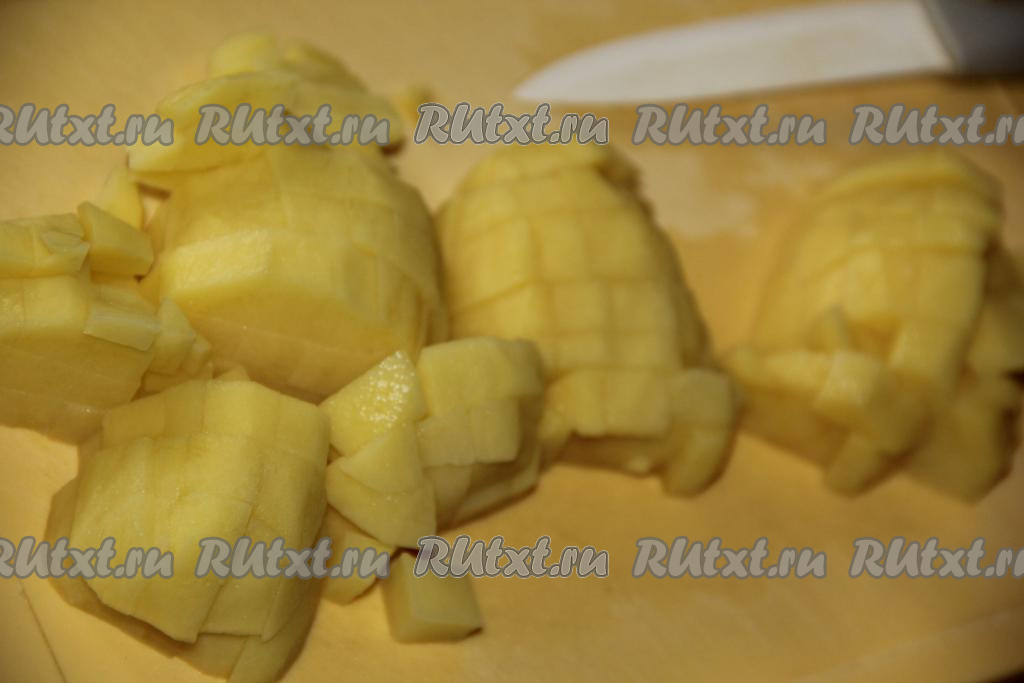 Для начала нужно сварить мясной бульон, я сделала борщ на курином бульоне. Залить половину куриной грудки на косточке 3 литрами воды и варить бульон с момента закипания минут 30 на небольшом огне. Затем вытащить мясо, отделить от костей и нарезать его на кусочки, шкуру и косточку убрать. Если будете готовить постный вариант борща, то просто вскипятите 3 литра воды.