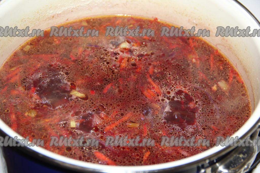 Когда картошка с краснокочанной капустой проварятся 15 минут, добавить лук, свеклу и морковку, варить борщ минут 10.