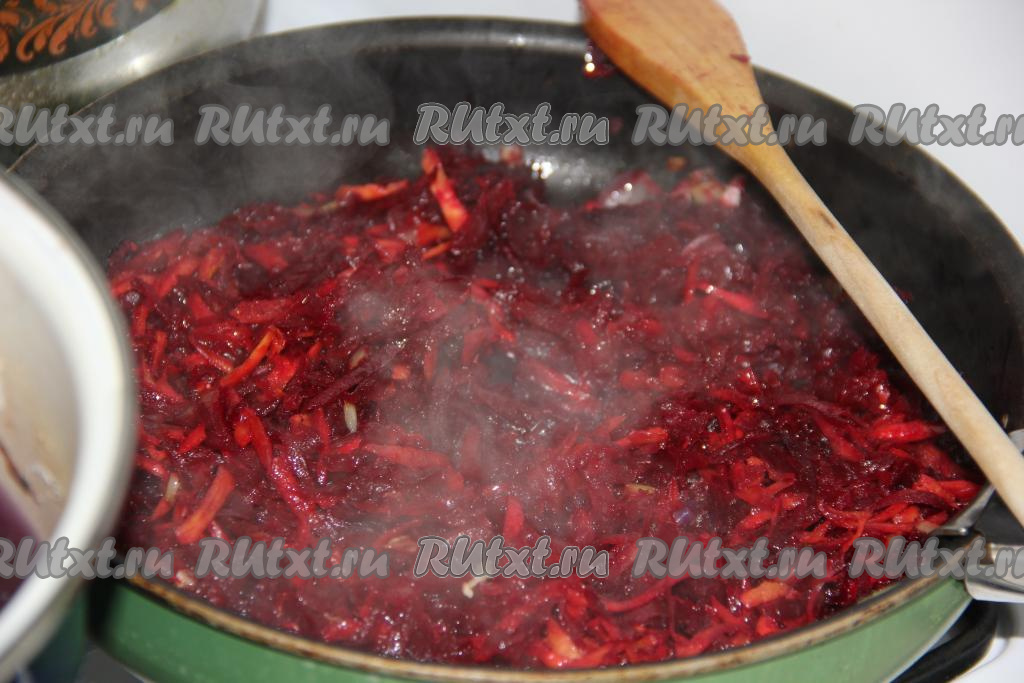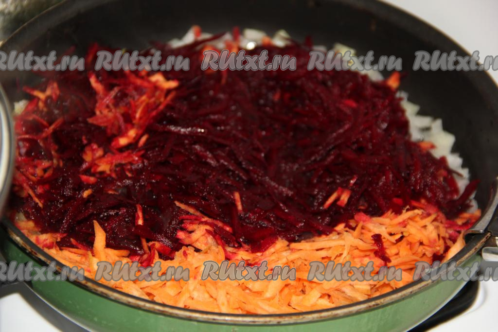Добавить свеклу с морковкой в сковороду к обжаренному луку.