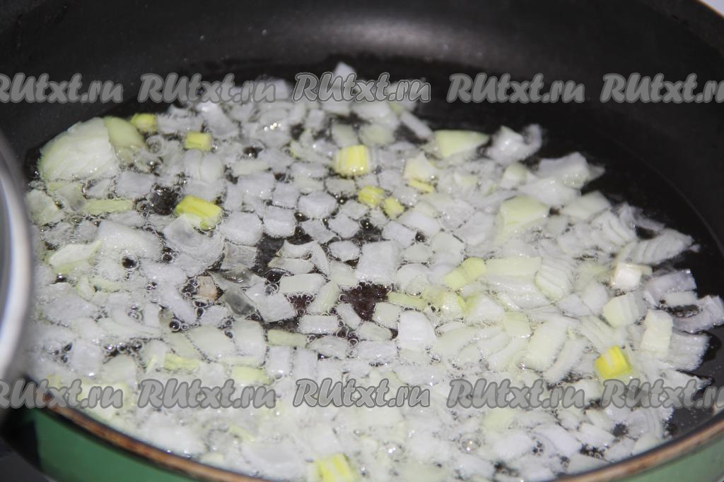 Очистить лук, а затем мелко нарезать и обжарить на разогретом растительном масле в течение 3 минут на среднем огне, помешивая.