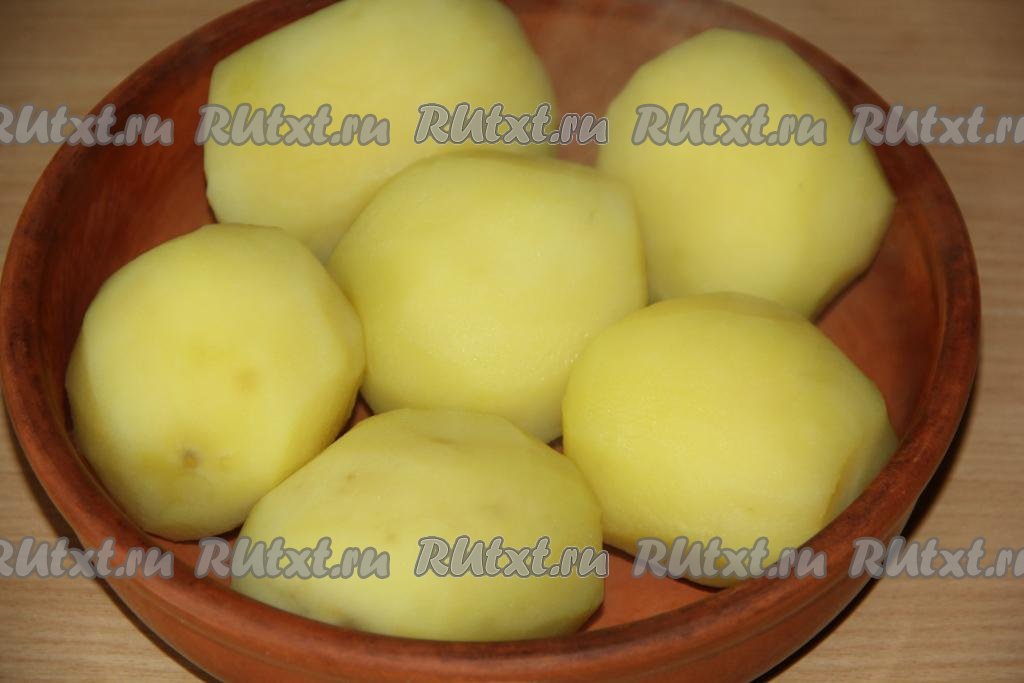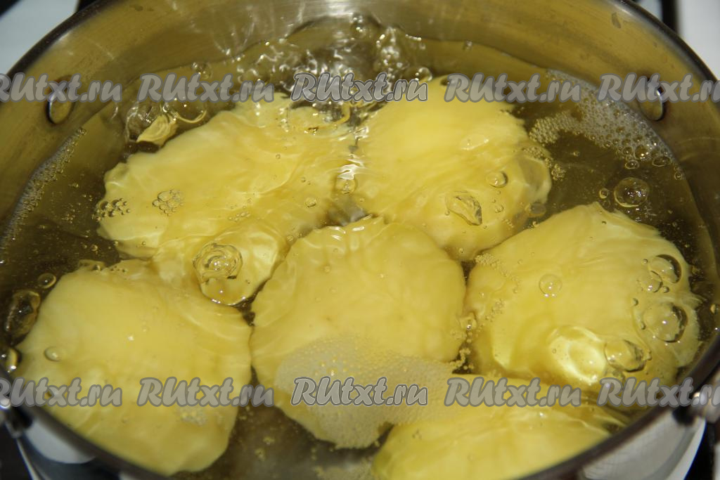 Картофель почистить. Воду влить в кастрюлю и довести до кипения, опустить картошку в кипящую воду.