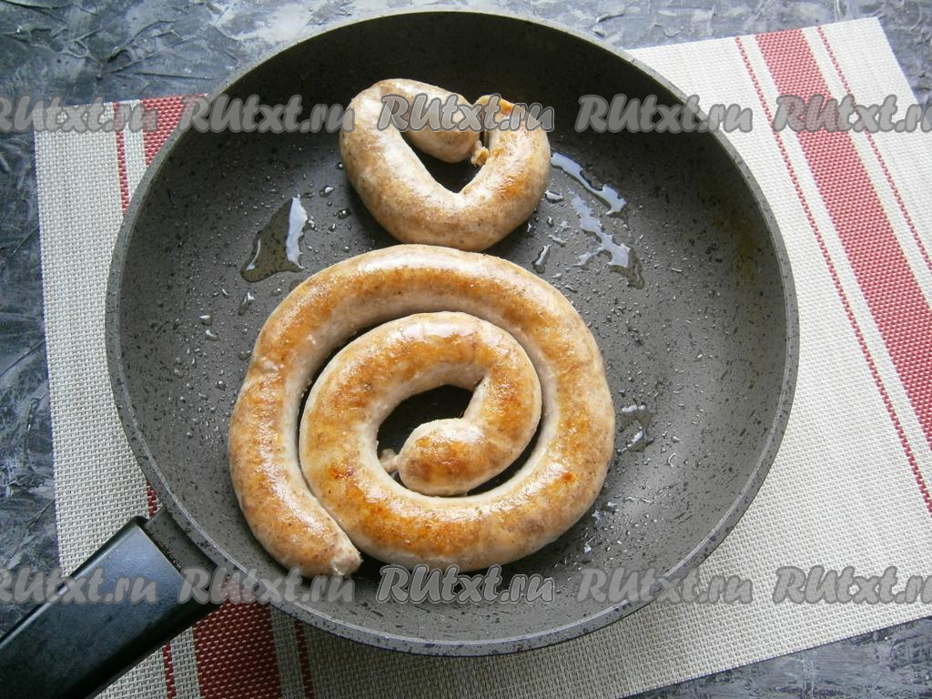 Обжарить колбасу на сковороде на растительном масле (или другом жире) до румяности с двух сторон на среднем огне.