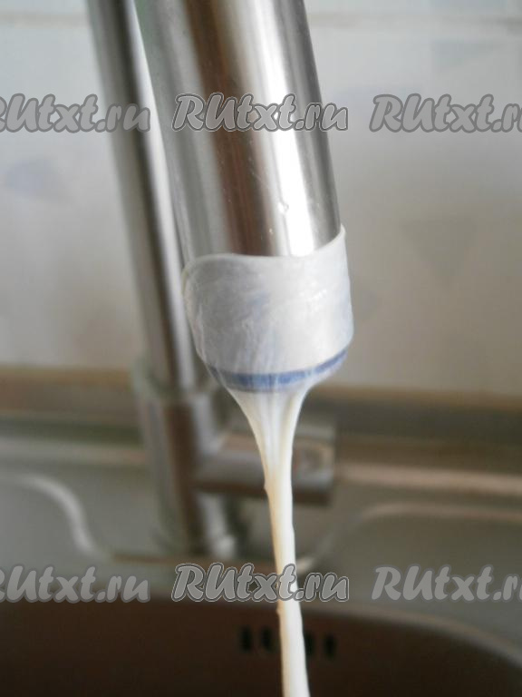 Далее кишки нужно промыть внутри под проточной водой. Делается это так: один конец кишки нужно надеть на гусак крана, включить воду и промыть под напором воды.