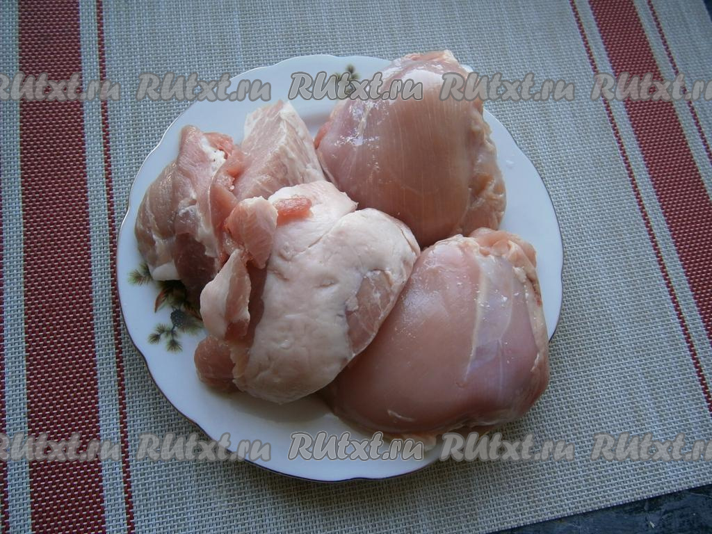 С куриных бёдер снять шкуру, свинину нарезать.