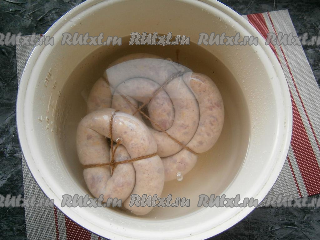 Колбасу проколоть иголкой в нескольких местах со всех сторон и поместить её в кастрюлю с холодной водой. Довести воду до кипения и варить домашнюю колбасу из курицы и свинины на самом слабом огне 30-40 минут. Я делала это в мультиварке на режиме "Варка на пару", выставив температуру 90 градусов и время - 1 час.