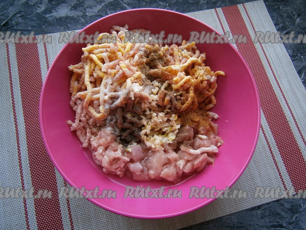 Добавить в фарш мелконарезанную курятину, соль, чёрный молотый перец, кориандр, мускатный орех, приправу к мясу и пропущенный через пресс чеснок, влить 100 мл холодной воды.