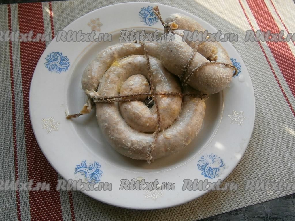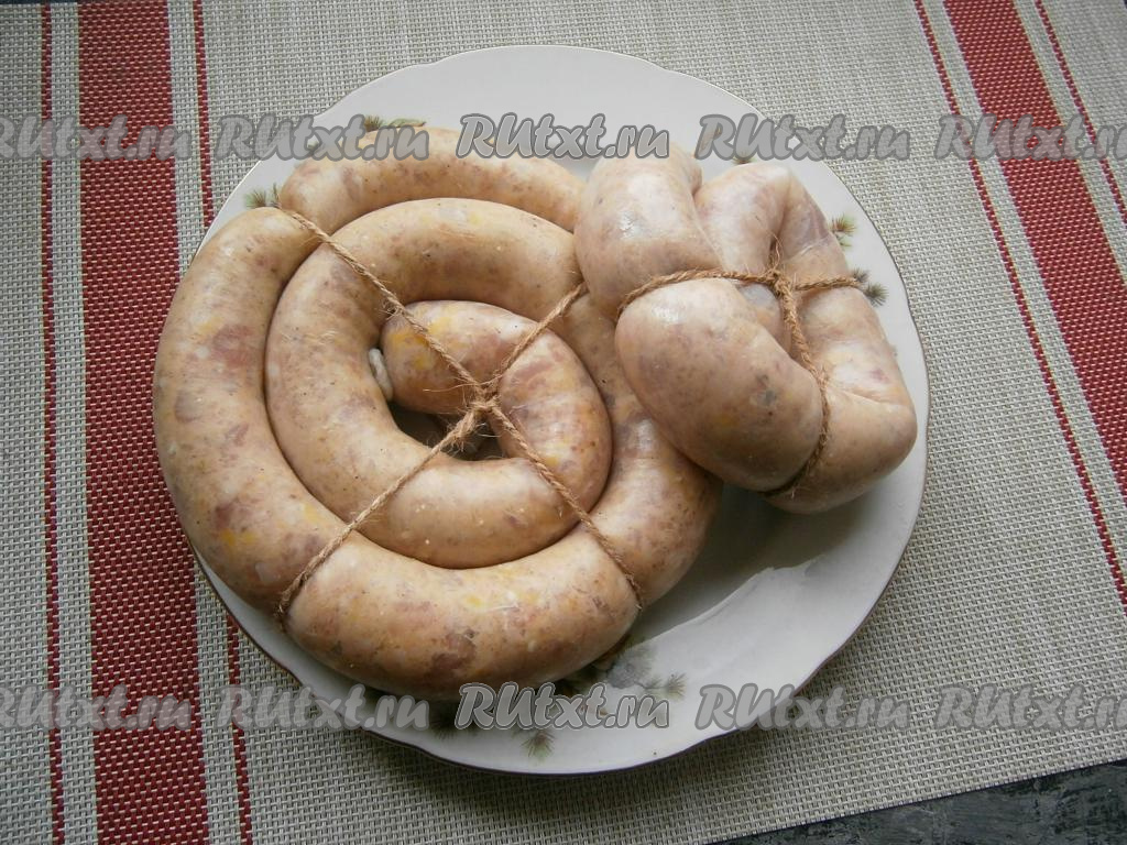 Наполнять кишки нужно не слишком плотно, края перевязать. Свернуть колбасу в колечки и перевязать шпагатом (как на фото).