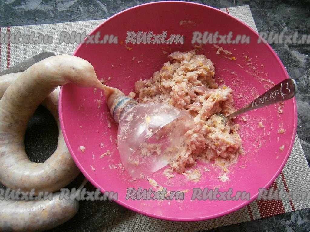 Кишки наполнить фаршем с помощью специальной насадки для мясорубки или обрезанной пластиковой бутылки. Я использую второй вариант, так как много колбасы я не делаю.