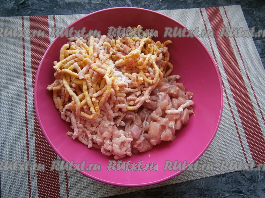 С куриных бёдер срезать мясо, удалив кости, а затем нарезать на маленькие кусочки. Свинину вместе с салом и жиром перекрутить на мясорубке с мелкой решеткой.