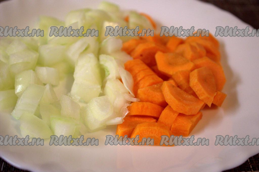 Репчатый лук очистить, помыть, нарезать на средние кубики. Очищенную морковь нарезать полукружочками.
